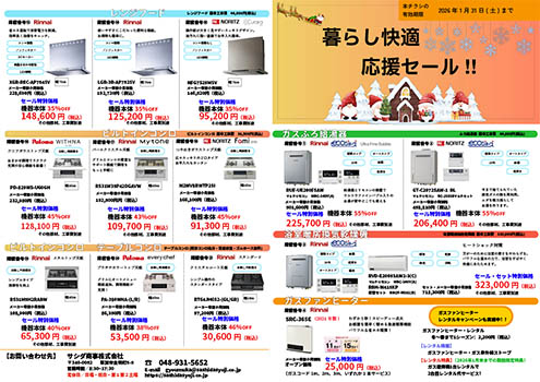 暮らし快適 応援セール!! 2025年12月3日 最終更新日時 : 2025年12月3日 sashida-admin 暮らし快適 応援セール!!を行っております。こちらのキャンペーンは2026年1月31日(土)までになります! 新しい住宅設備機器で冬を快適に過ごしませんか? 画像をクリックでpdfが開きます。 お問い合わせ先サシダ商事株式会社 048-931-5652