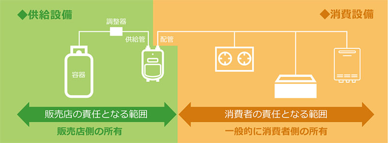容器からマイコンメーターまでは、供給設備と呼ばれ、この部分はLPガス販売店が責任をもって安全管理します。