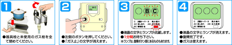 ※この手順を実施しても復帰しない場合は、復帰を繰り返さずにLPガス販売店にご連絡し、点検を受けてください。